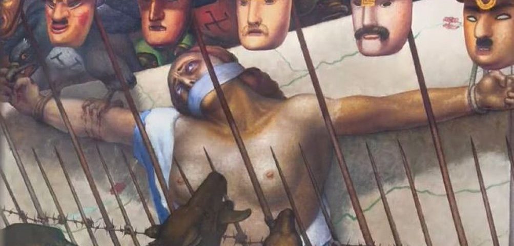 Ai loro piedi, diavoli e aguzzini che a volte avevano le sembianze del Duce, Benito Mussolini, del “Vate” Gabriele D’Annunzio e anche con quelle di altri gerarchi dell’epoca. Accanto a loro uomini in camicia nera con il pugnale alzato e più tardi anche gente in camicia bruna e diavoli con il volto di Adolf Hitler.