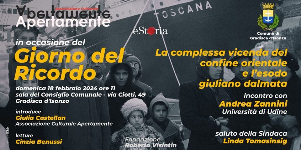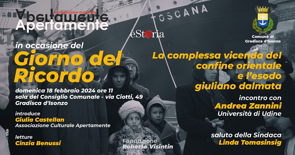 Organizzato dal Comune di Gradisca d’Isonzo e dall’ Associazione culturale Apertamente, con la collaborazione di èStoria, si terrà, domenica 18 febbraio alle 11, presso la sala del Consiglio comunale di Gradisca d’Isonzo, un incontro nella ricorrenza del Giorno del Ricordo.