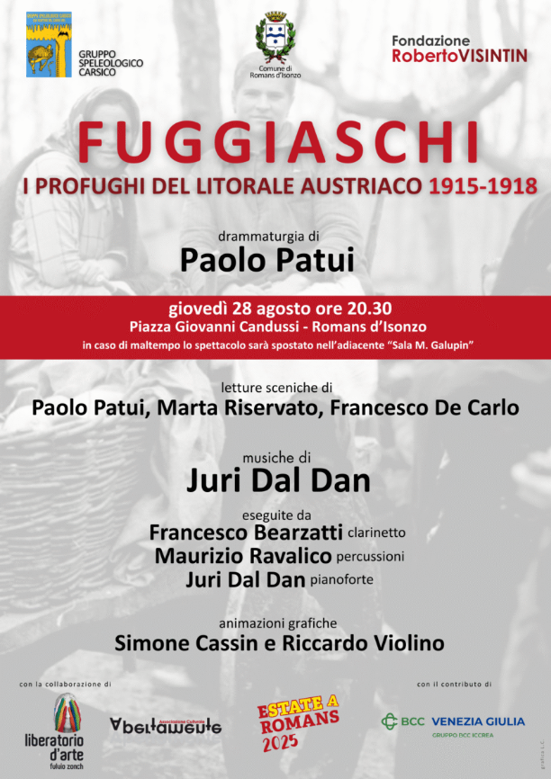 Nell’ambito di Romans Estate 2025, il 28 agosto, lo spettacolo teatrale Fuggiaschi di Paolo Patui scrittore e drammaturgo, promosso dal Gruppo speleologico di San Martino del Carso e dalla Fondazione Roberto Visintin, con la collaborazione del Comune di Romans d’Isonzo e di altri preziosi contributi, Associazione culturale Apertamente, Liberatorio d’arte e della Bcc della Venezia Giulia.